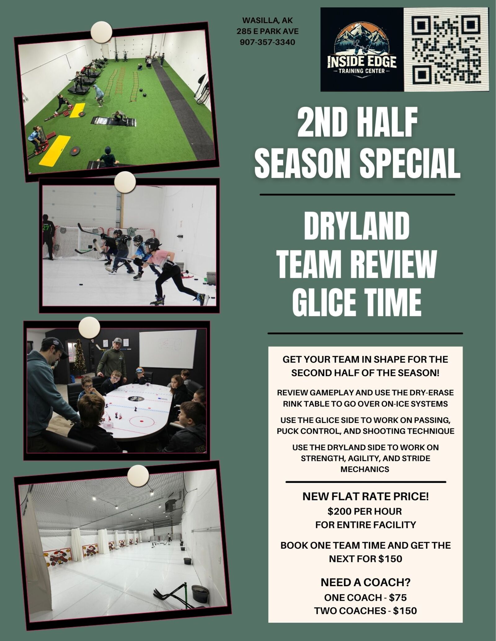 Enhance your hockey skills at Inside Edge Training Center. Train in our dryland area to build strength, endurance, agility, and stamina and take advantage of our fully Glice shooting zone to develop your stick-handling and shooting skills. Adjacent to the lobby, coaches can utilize our team room for video review and take advantage of a large whiteboard and dry-erase hockey table for strategy and planning.